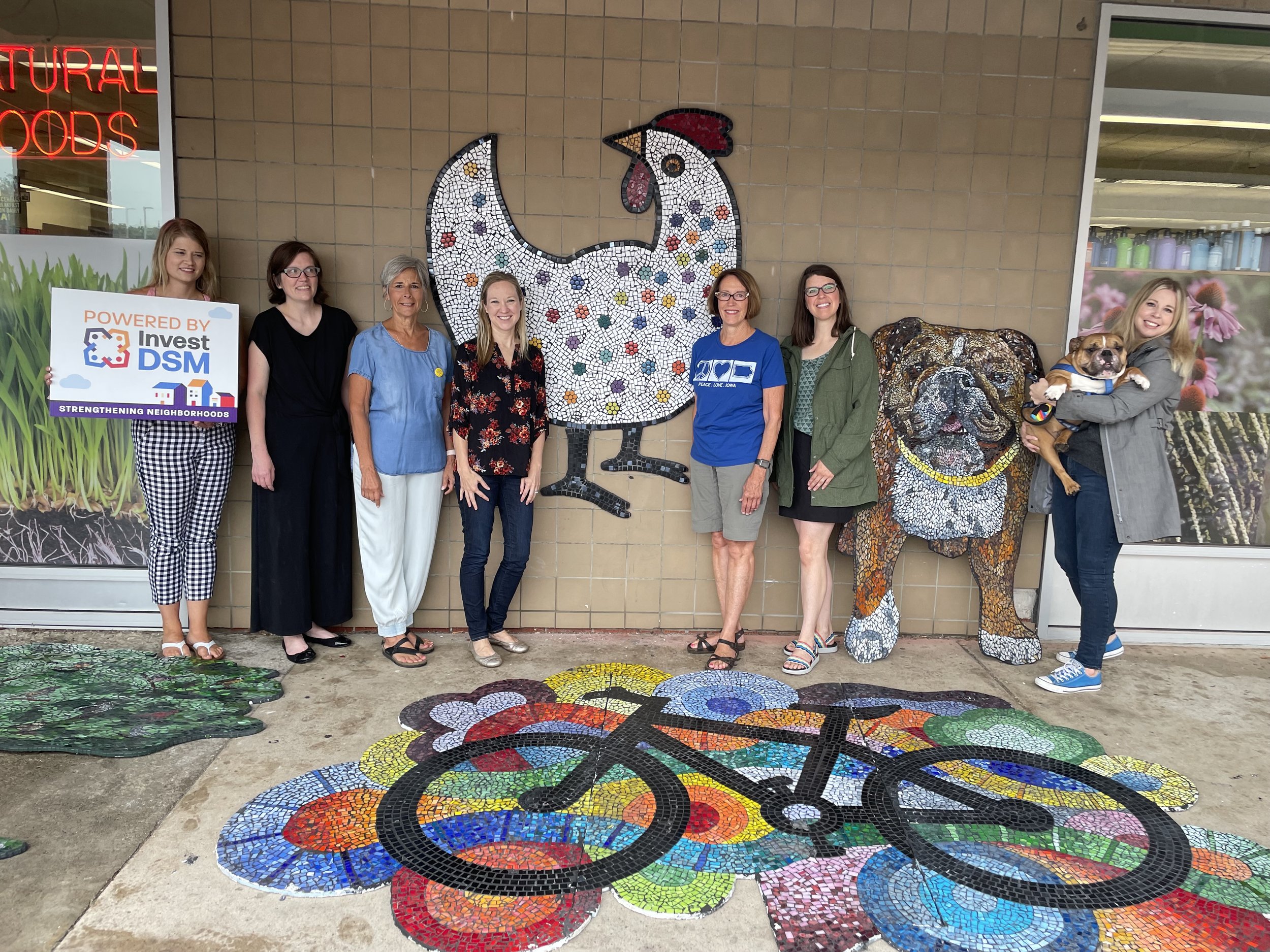 Four mosaic murals fitting four themes (bikes, chickens, trees, and dogs) were installed at four locations in the Franklin Area Neighborhood. Themes were developed to fit the neighborhood and avoid problems with Des Moines policies: the artwork cannot appear to constitute an advertisement or sign.