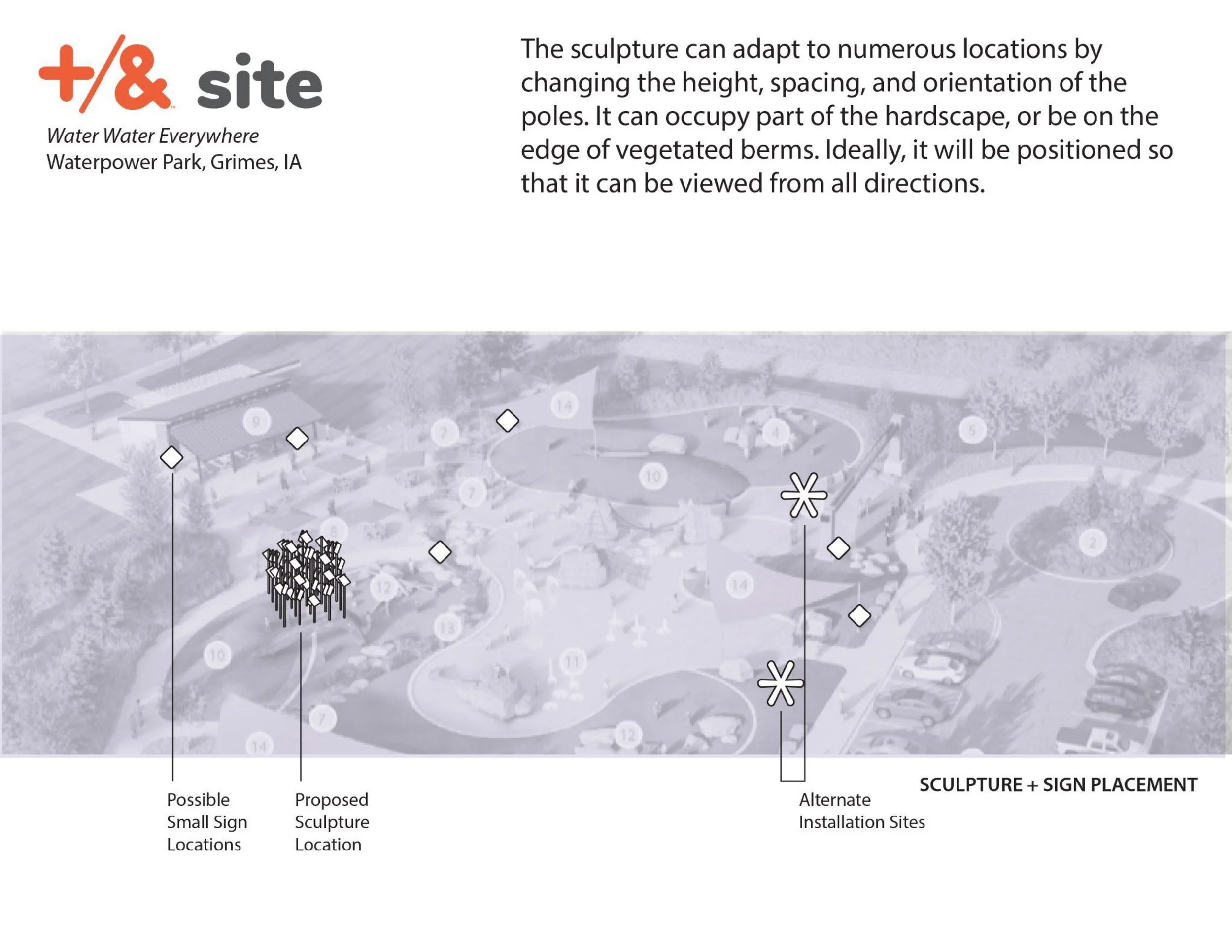 Water Water Everywhere is shaped out of familiar urban materials to both create an unexpected play environment and ask important questions about the role of water in our lives. The main sculpture invites visitors to move around and through it, and to climb to different spots in the park for a different perspective of the piece. Water Water Everywhere is a sculpture, a scavenger hunt, and a conversation with and about water, hidden in plain sight.